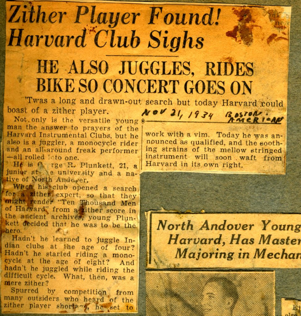 Plunkett, formerly only a monocyclist-juggler, learned to play the zither last year after the Harvard Instrumental Clubs discovered among its archives an antiquated zither score of “Ten Thousand Men of Harvard.” He took on the job only after prolonged search had disclosed no zither players in the undergraduate body.