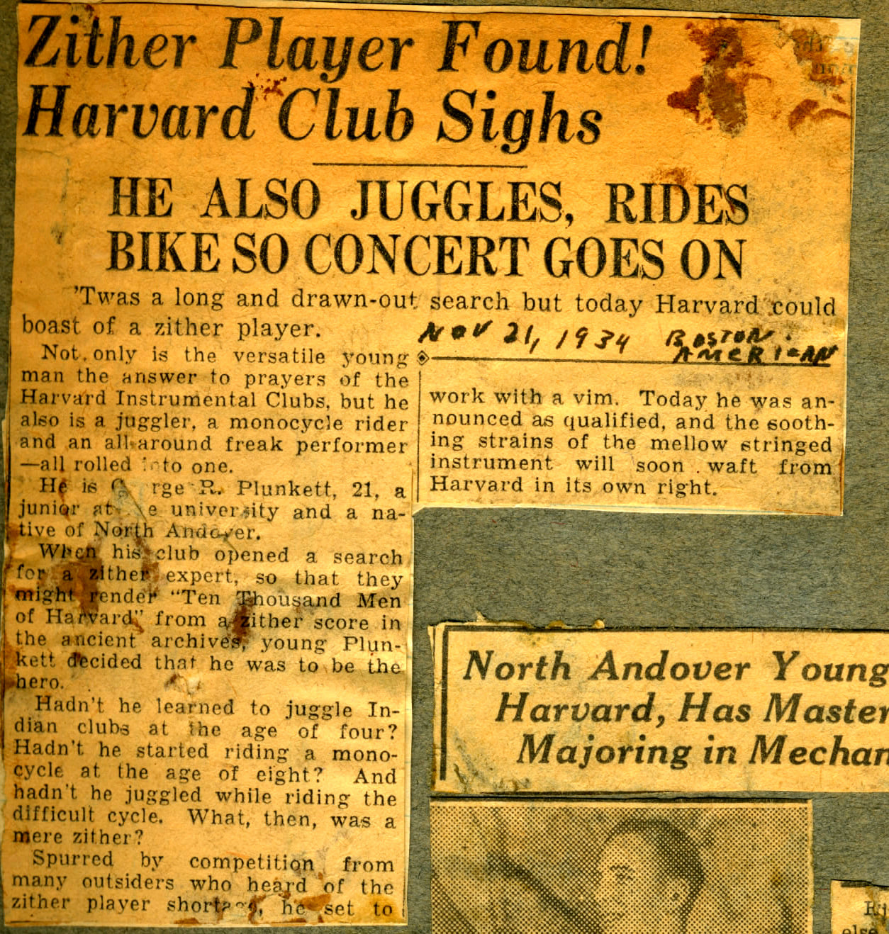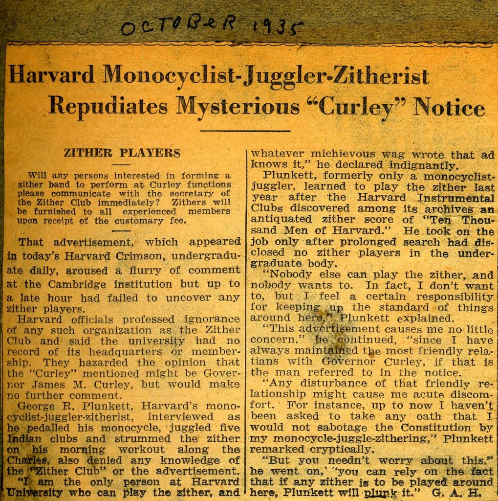 George R. Plunkett, Harvard’s monocyclist-juggler-zitherist, interviewed as he pedalled his monocycle, juggled five Indian clubs and strummed the zither on his morning workout along the Charles, also denied any knowledge of the “Zither Club” or the advertisement.