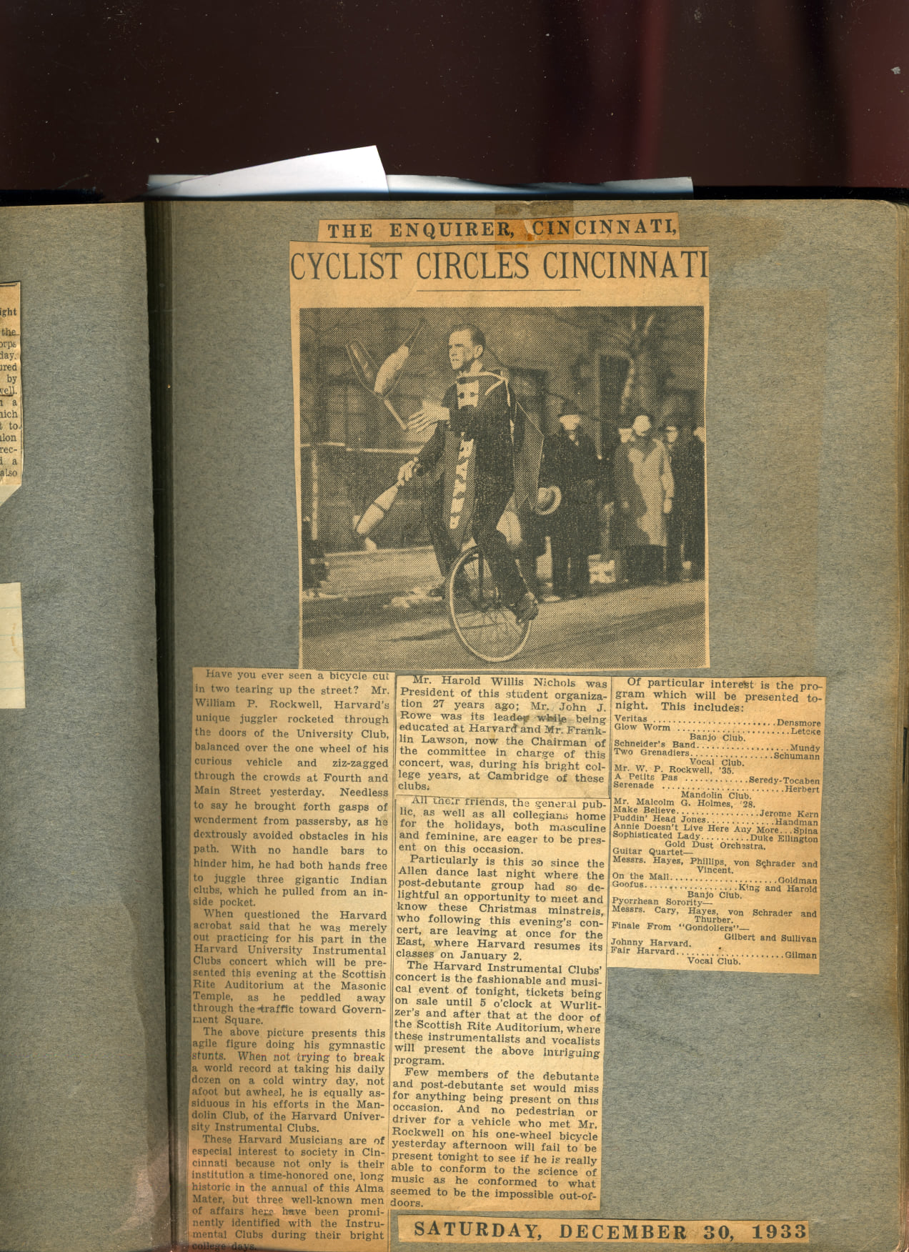 Have you ever seen a bicycle cut in two tearing up the street? Mr. William P. Rockwell, Harvard’s unique juggler, rocketed through the doors of the University Club, balanced over the one wheel of his curious vehicle and zig-zagged through the crowds at Fourth and Main Street yesterday. Needless to say he brought forth gasps of wonderment from passersby, as he dextrously avoided obstacles in his path. With no handle bars to hinder him, he had both hands free to juggle three gigantic Indian clubs, which he pulled from an inside pocket.