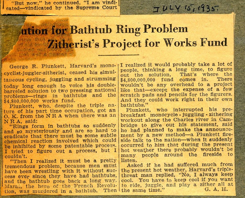 George R. Plunkett, Harvard’s mono-cyclist-juggler-zitherist, ceased his simultaneous cycling, juggling and strumming today long enough to voice his double-barreled solution to two pressing national problems—rings in bathtubs and the $4,800,000,000 works fund.