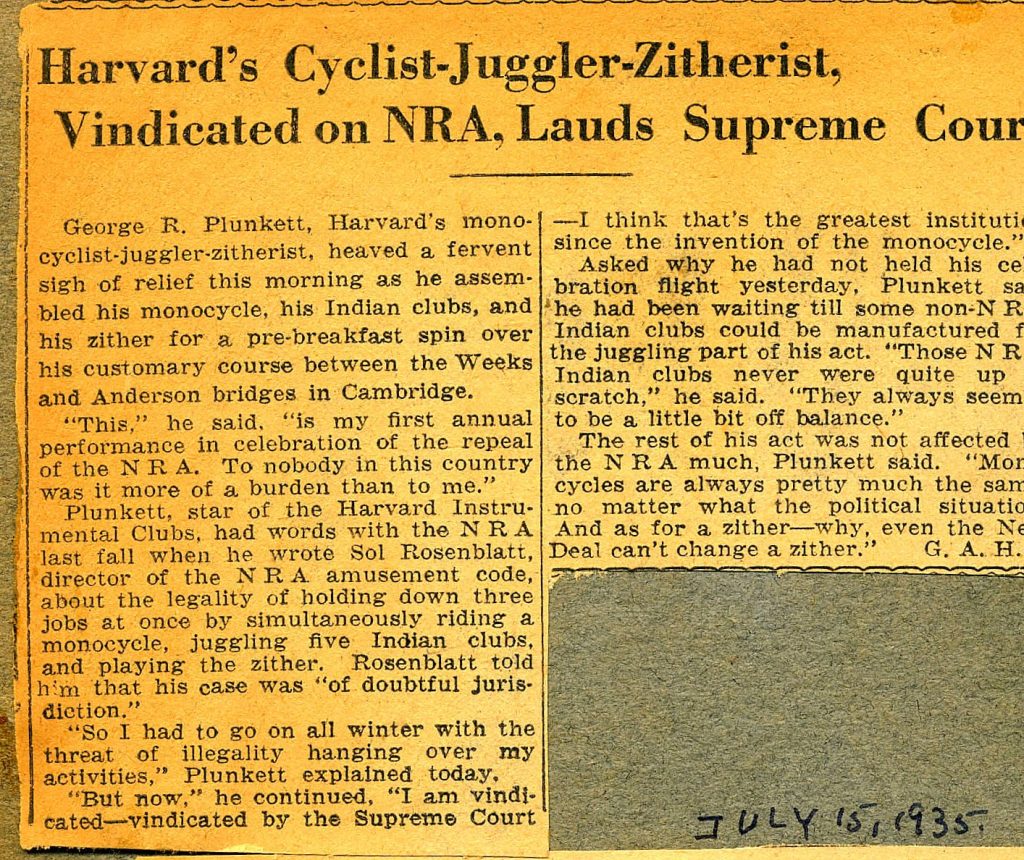 George R. Plunkett, Harvard’s mono-cyclist-juggler-zitherist, heaved a fervent sigh of relief this morning as he assembled his monocycle, his Indian clubs, and his zither for a pre-breakfast spin over his customary course between the Weeks and Anderson bridges in Cambridge.