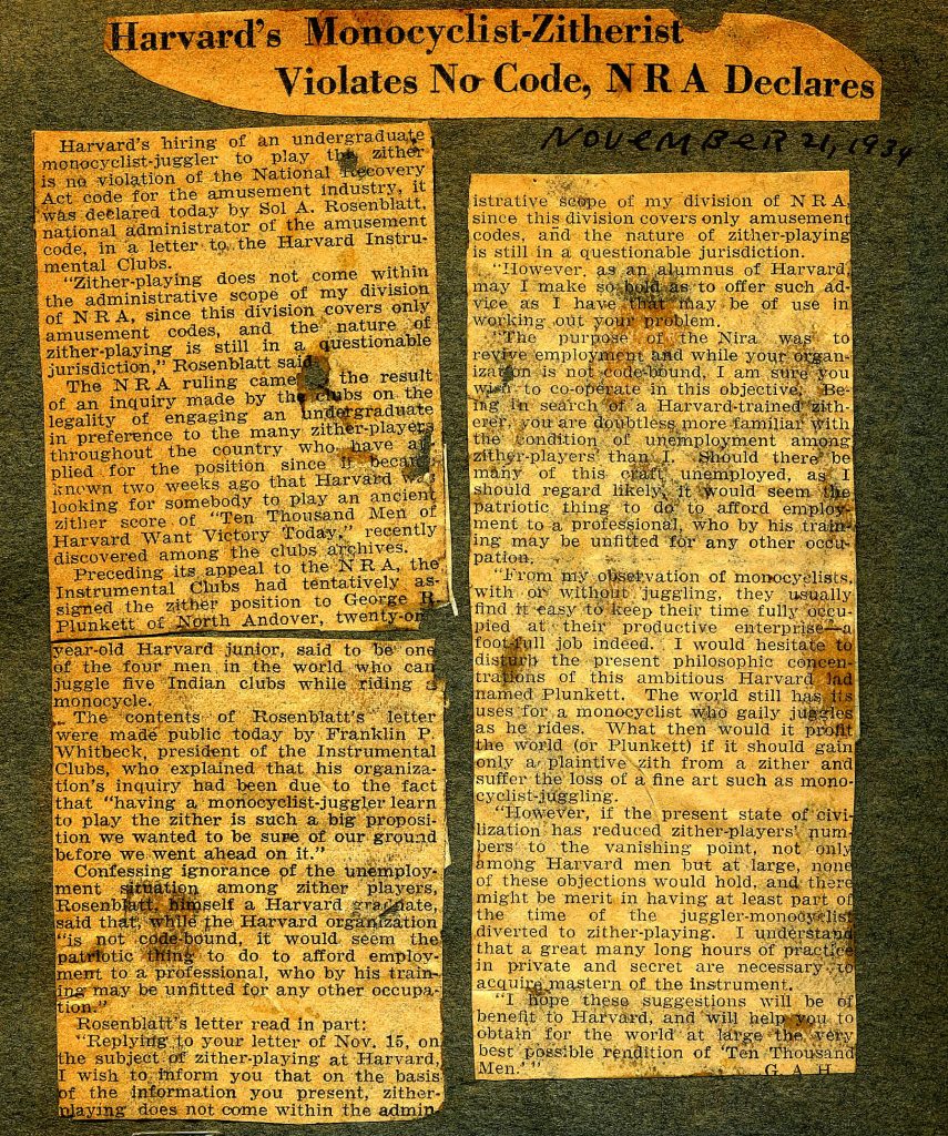 Confessing ignorance of the unemployment situation among zither players, Rosenblatt, himself a Harvard graduate, said that, “while the Harvard organization is not code-bound, it would seem the patriotic thing to do to afford employment to a professional, who by his training may be unfitted for any other occupation.”