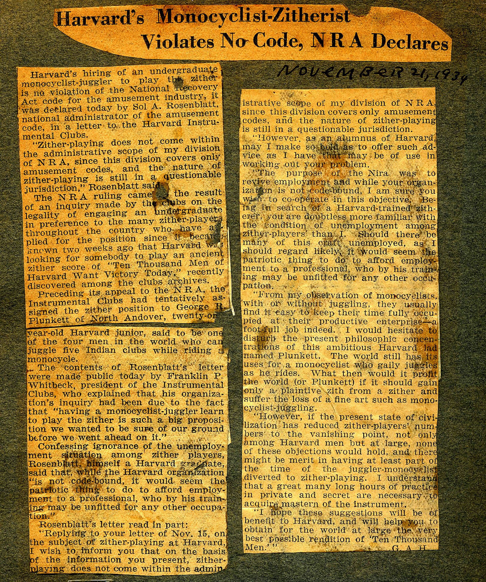 Harvard’s hiring of an undergraduate monocyclist-juggler to play the zither is no violation of the National Recovery Act code for the amusement industry, it was declared today by Sol A. Rosenblatt, national administrator of the amusement code, in a letter to the Harvard Instrumental Clubs.