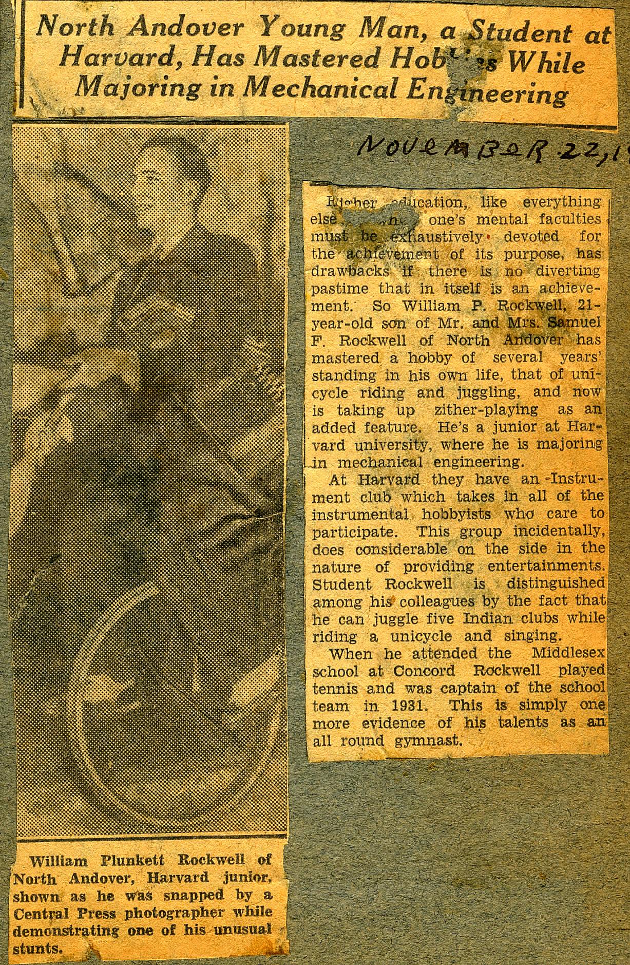 Higher education, like everything else that one’s mental faculties must be exhaustively devoted for the achievement of its purpose, has drawbacks if there is no diverting pastime that in itself is an achievement. So William P. Rockwell, 21-year-old son of Mr. and Mrs. Samuel F. Rockwell of North Andover has mastered a hobby of several years’ standing in his own life, that of unicycle riding and juggling, and now is taking up zither-playing as an added feature. He’s a junior at Harvard university, where he is majoring in mechanical engineering.