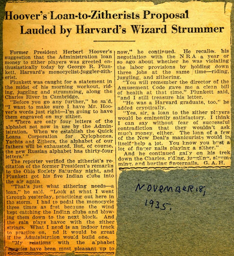 Former President Herbert Hoover’s suggestion that the Administration loan money to zither players was greeted enthusiastically today by George R. Plunkett, Harvard’s monocyclist-juggler-zitherist.